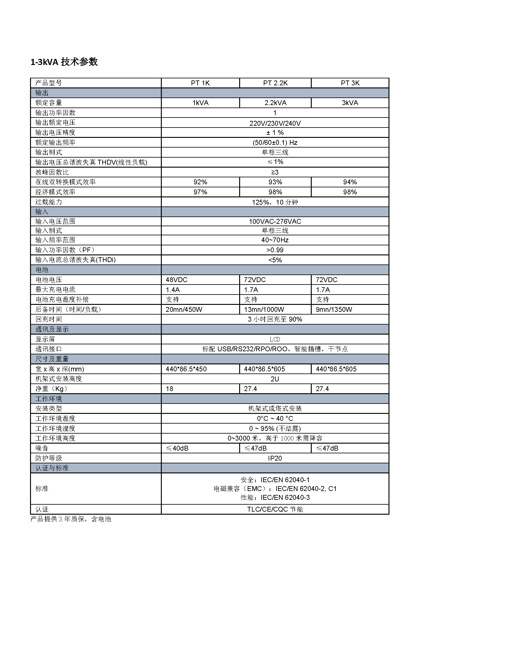 产品采用在线双变换结构,IGBT整流设计。 容量范围1kVA-10kVA